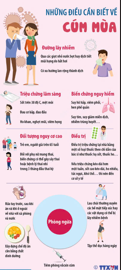 Bệnh cúm mùa là một bệnh nhiễm trùng đường hô hấp gây ra bởi virus cúm. Đây là bệnh truyền nhiễm rất phổ biến, đặc biệt vào mùa đông và xuân, khi thời tiết lạnh và độ ẩm cao tạo điều kiện cho virus phát triển. Dưới đây là một số thông tin tuyên truyền quan trọng về bệnh cúm mùa: